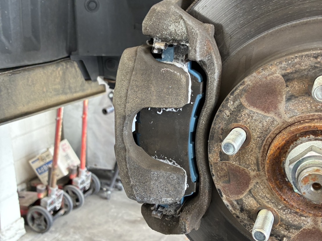 車両をリフトアップし、フロントキャリパーを取り外してパッドを点検。摩耗が進んでおり、交換時期を迎えていました。