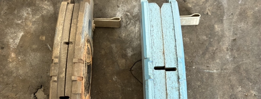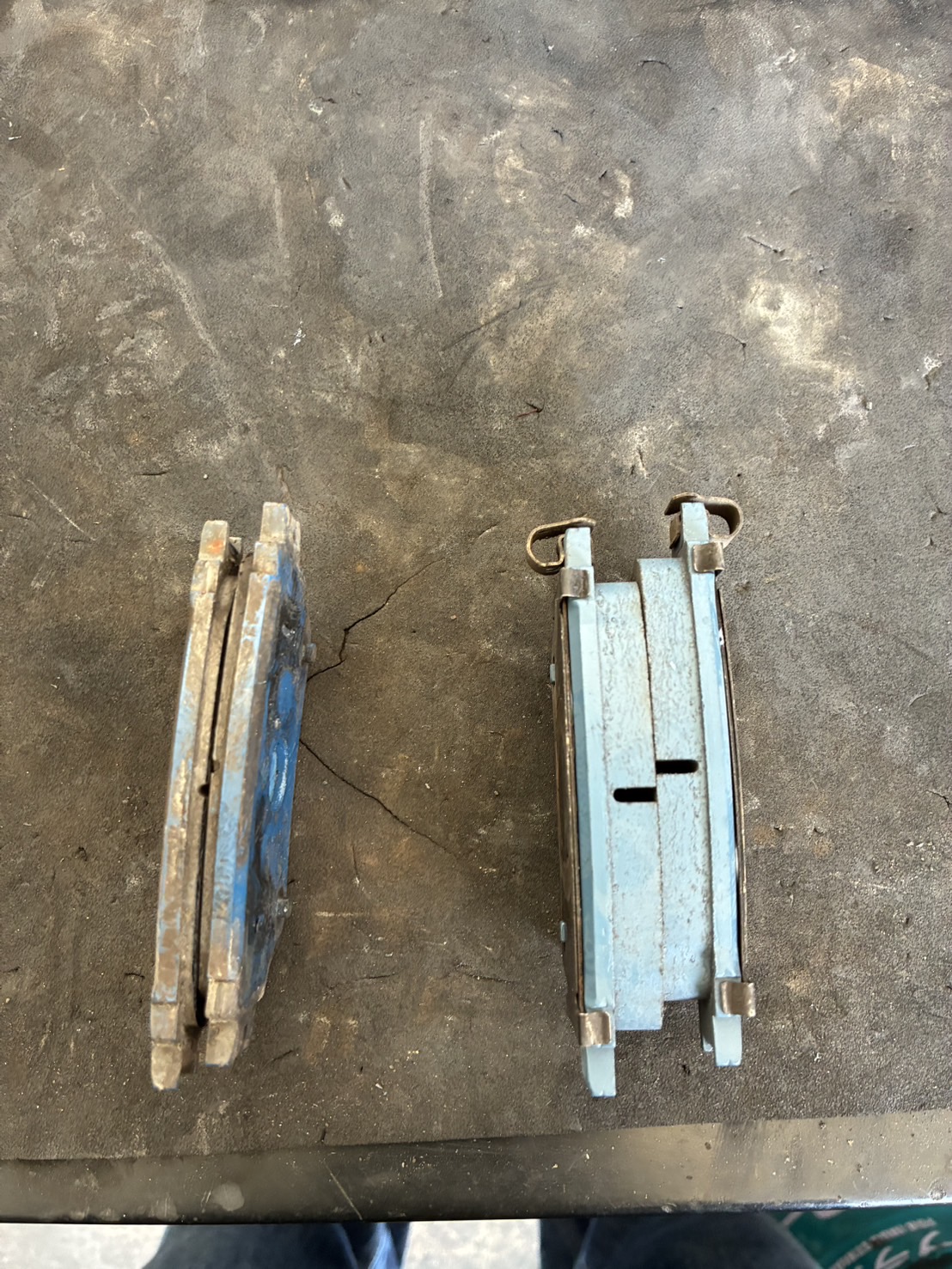 厚みの違いは一目瞭然です。新品は青いバックプレート付きで、鳴き止めグリスも塗布しました。
