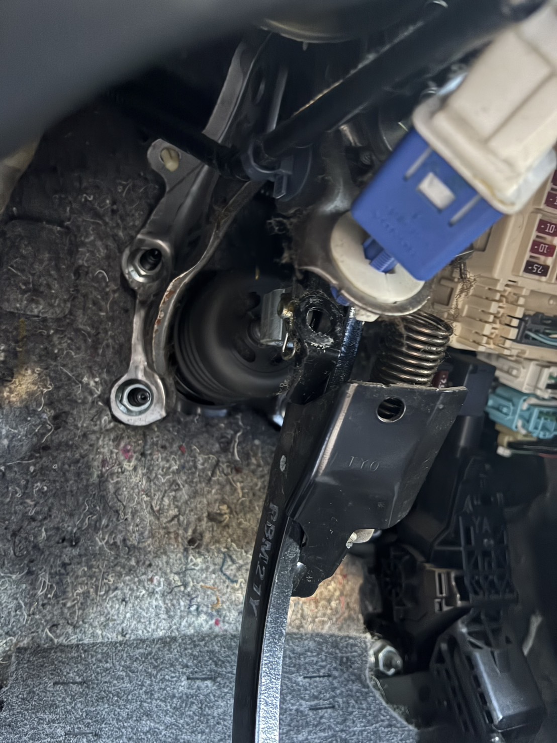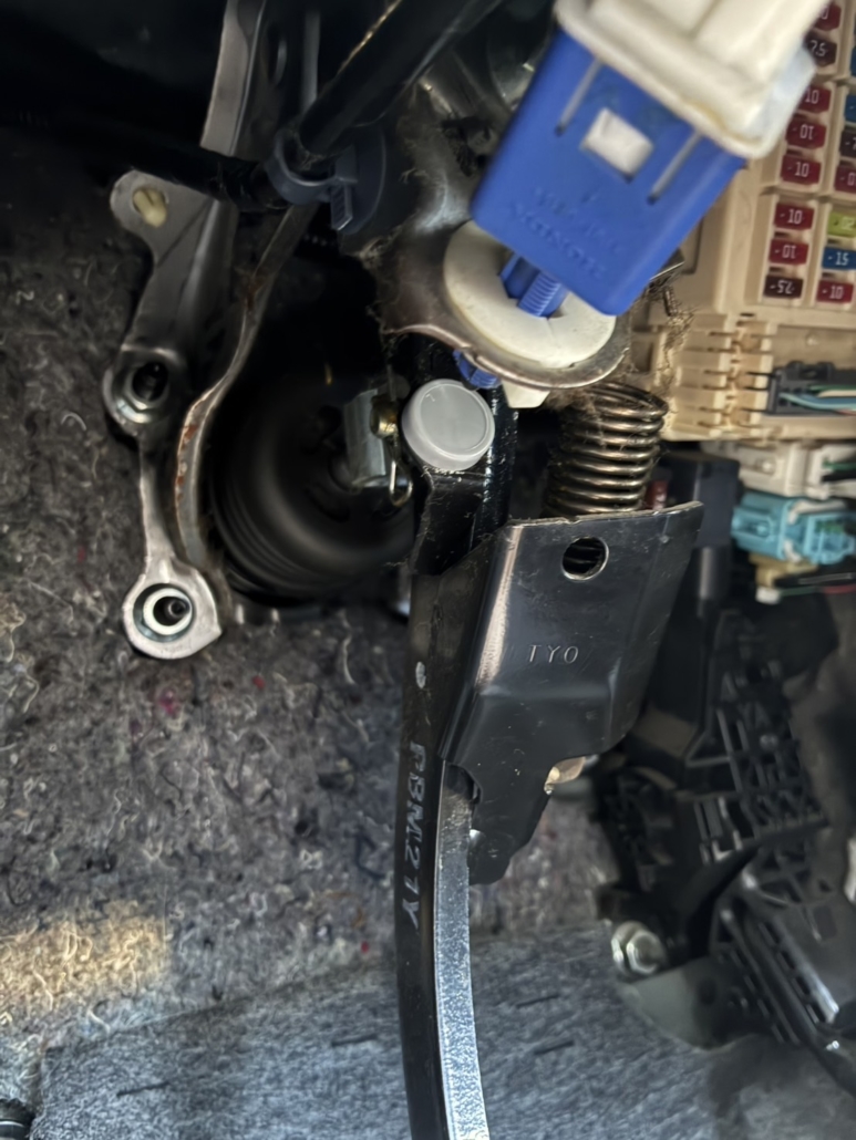 ブレーキペダル上部のストッパーが砕け落ち、センサー部分がむき出しになっていました。そのためブレーキランプが常時点灯する状態でした。