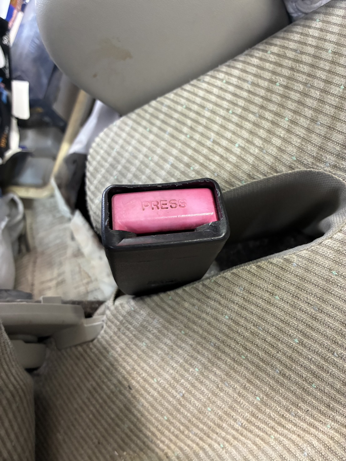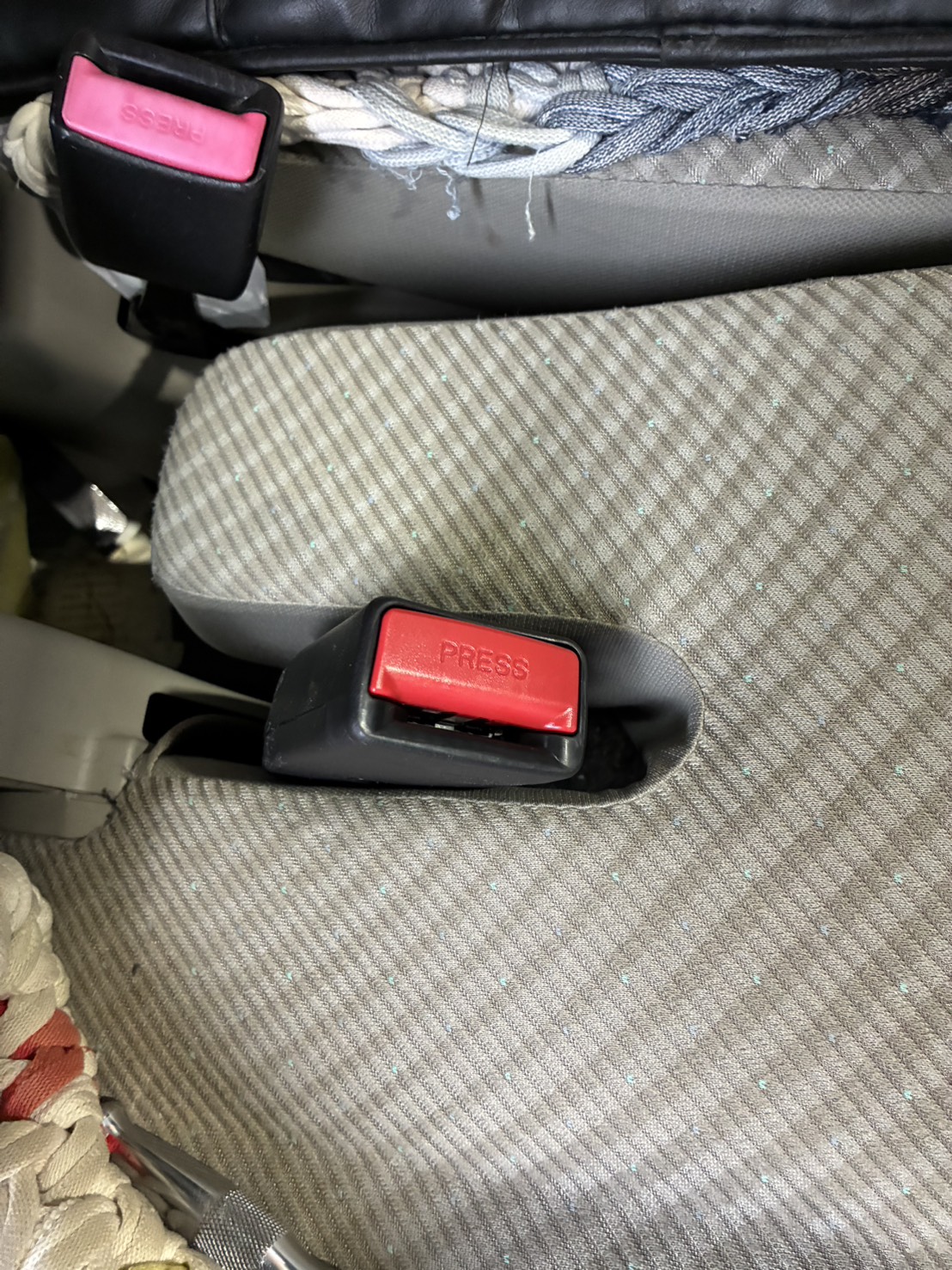 今回のワゴンRでは、バックルのボタンがスムーズに戻らず、固定・解除が安定しない状態でした。写真でも、旧品側のボタンに色あせや摩耗が見られ、長年の使用による劣化が進んでいることが分かります。