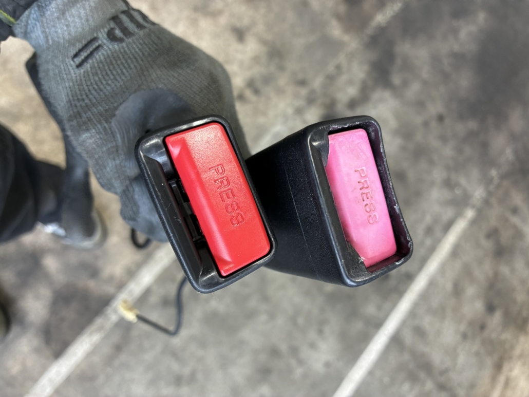 今回のワゴンRでは、バックルのボタンがスムーズに戻らず、固定・解除が安定しない状態でした。写真でも、旧品側のボタンに色あせや摩耗が見られ、長年の使用による劣化が進んでいることが分かります。